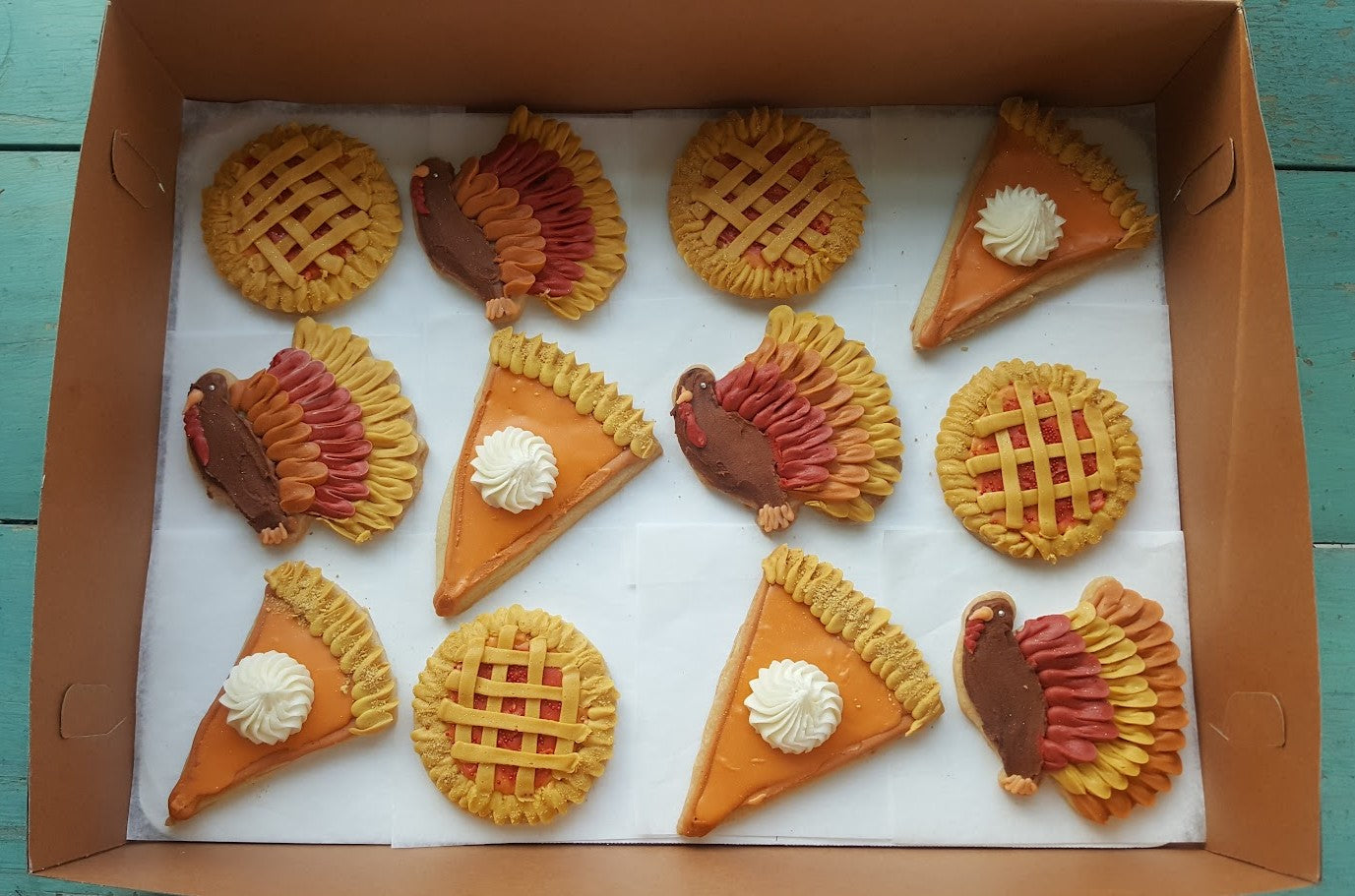 Our hand decorated Sugar Cookies (a daily sell out) have been given a Thanksgiving twist! Deliciously large at 4" each and decorated by hand for the season with buttercream and a soft sugar cookie icing, our TURKEY TIME SUGAR COOKIES are available with 4, 6, or 8 cookies (you choose).