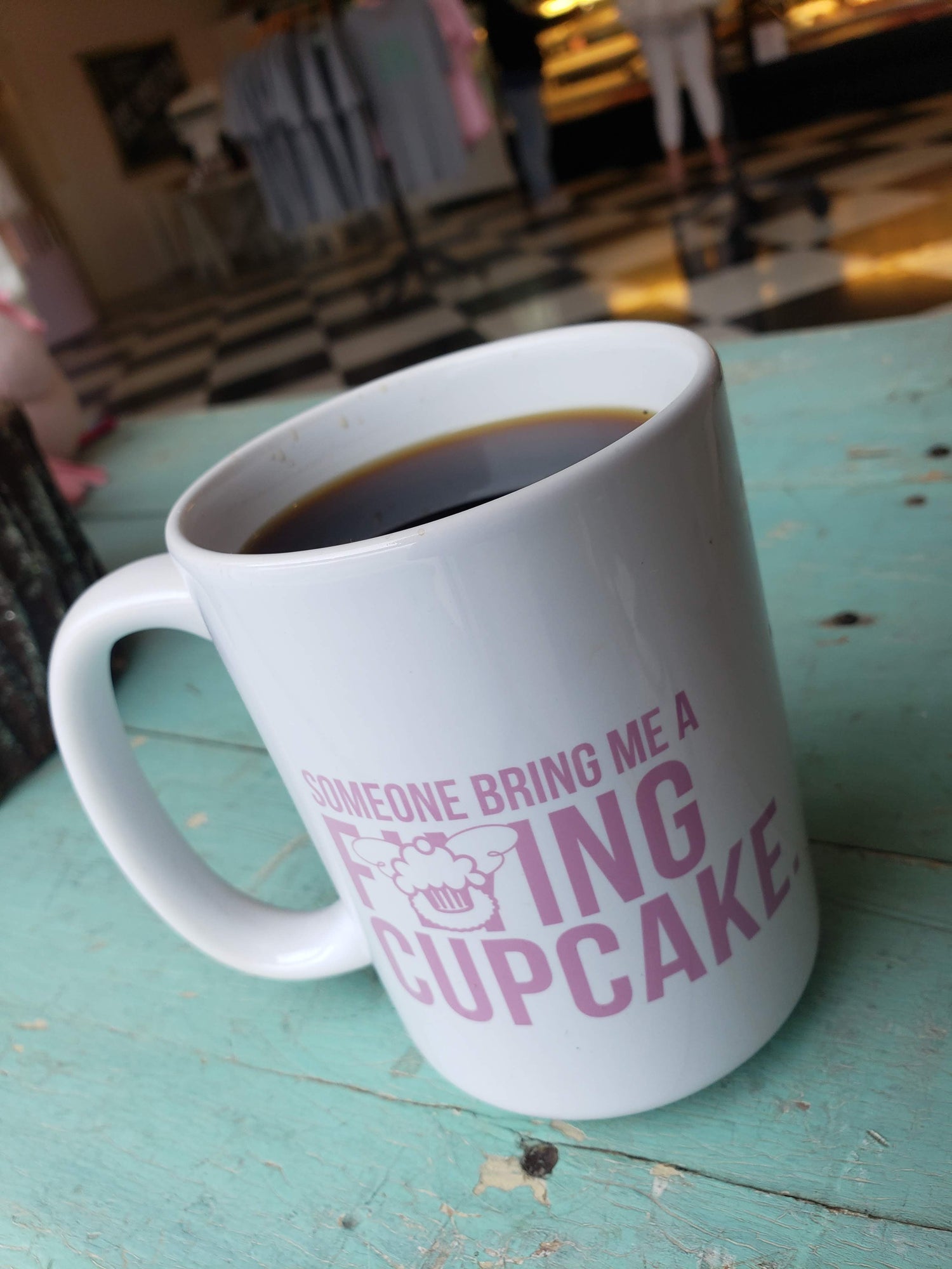 SOMEONE BRING ME A FLYING CUPCAKE! Ceramic Mug.  Featured in our signature PINK logo or or signature VINTAGE GREEN logo, each mug is 16oz and printed locally here in Indianapolis. Start each day in a cheeky way!