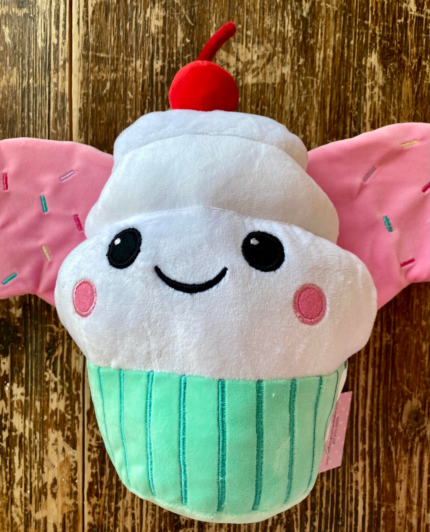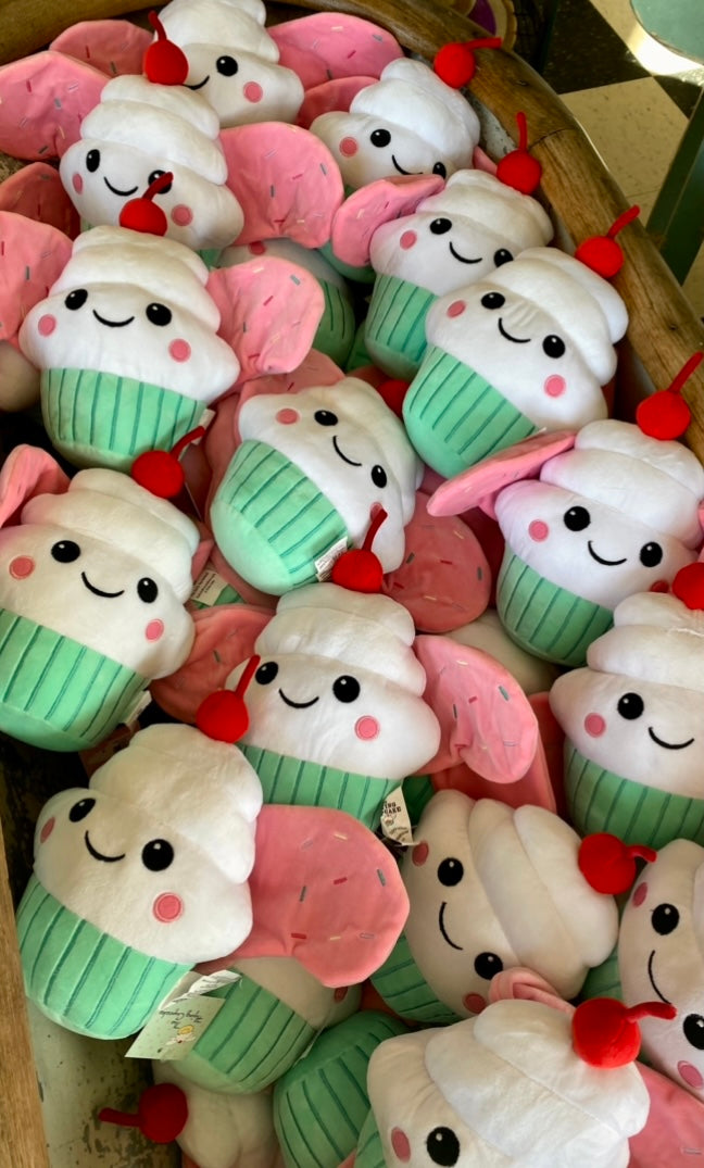 Meet our newest member of the team... our logo, Sally Sprinkles! She is adorable, soft, and plush with pink wings with sprinkles and a cherry on top! Sally is our Flying Cupcake logo with a smile.