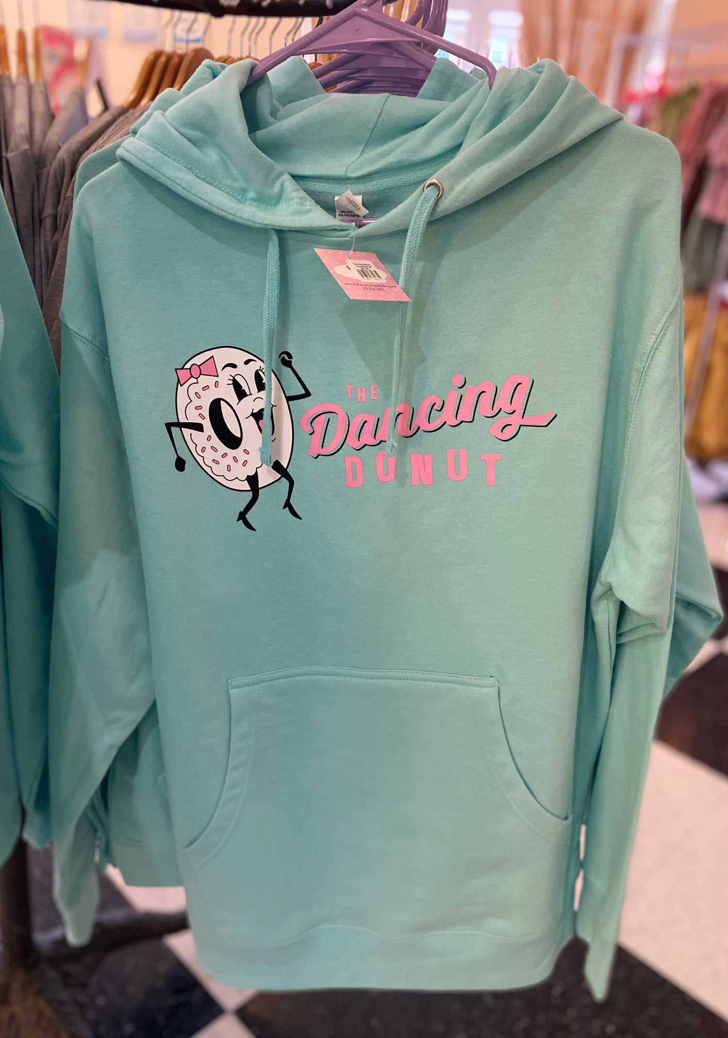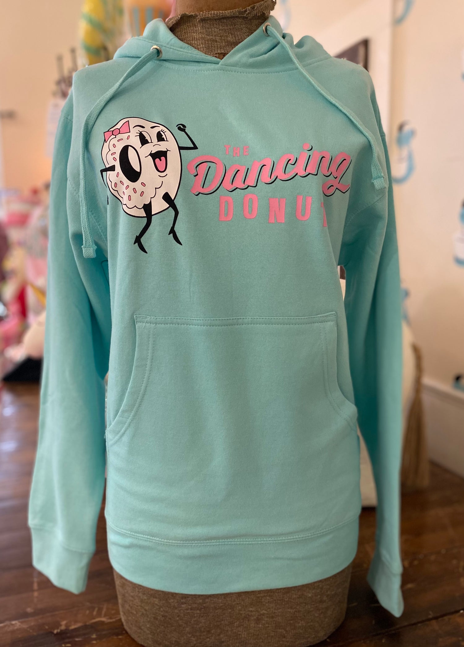 Nostalgic for a taste of our beloved but dearly departed Dancing Donut?  Our 100% Cotton unisex hoodie sweatshirt customized with Trixie herself in our signature minty blue green and pink color combo makes the perfect gift for yourself or someone who also is missing this SoBro legacy.